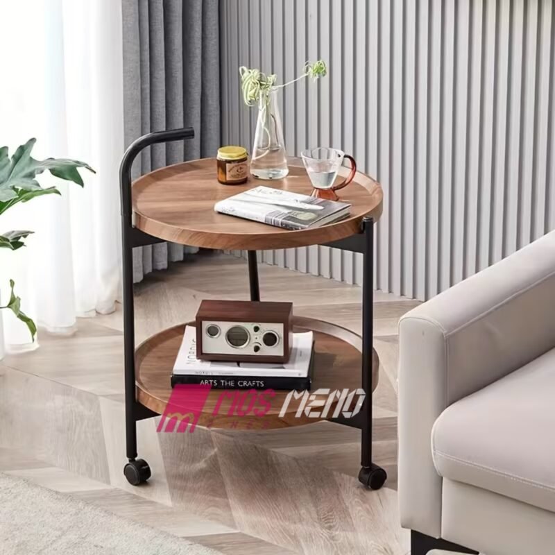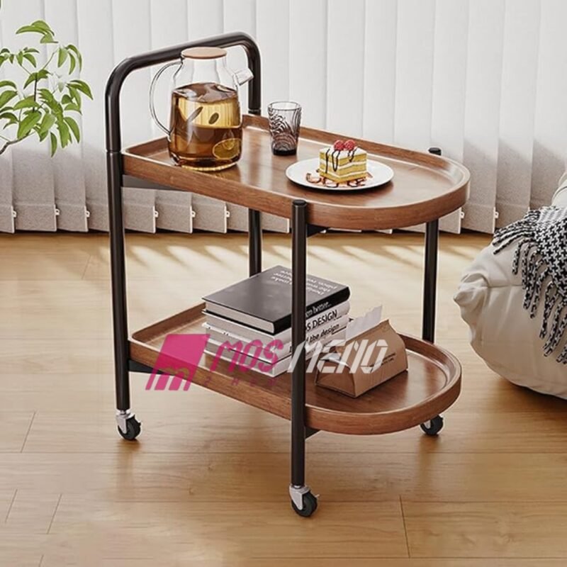 Karrocë Shërbyese me Rrota (2 Nivele) – Dizajn Druri dhe Kornizë e Zezë
