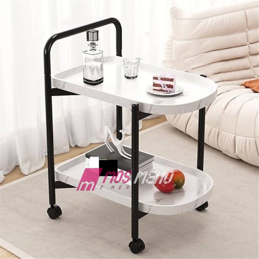 Kjo karrocë shërbyese me dy nivele, e përkryer për shërbim dhe dekorim, sjell stil industrial dhe modern në shtëpinë tuaj. Sipërfaqet ovale imitojnë mermerin elegant të bardhë, ndërsa korniza metalike e zezë siguron stabilitet dhe kontrast. Me dorezën praktike dhe rrotat lëvizëse, transporti i ushqimeve dhe pijeve bëhet i lehtë dhe i shpejtë.