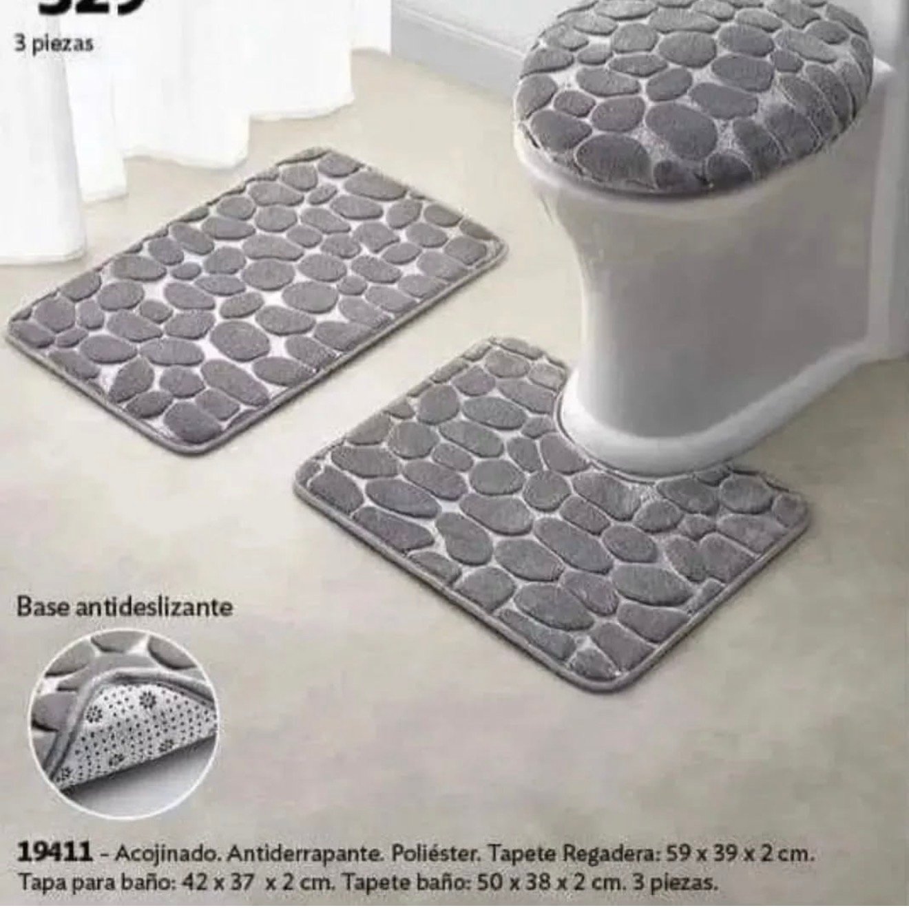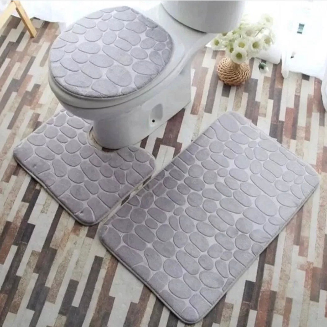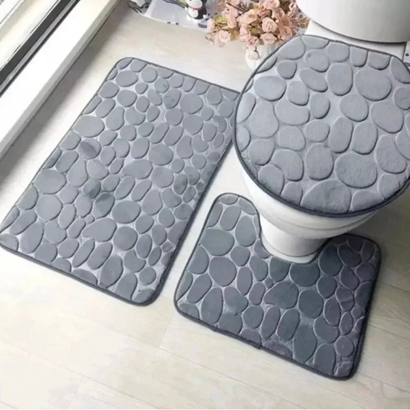 Set tapetësh banjoje prej 3 copësh, me dizajn elegant gurësh dhe material shumë të butë për ndjesi komode. Të gjitha pjesët janë antirrëshqitëse, thithin ujin shpejt dhe qëndrojnë mirë në vend. Jepin pamje moderne dhe të rregullt banjos.