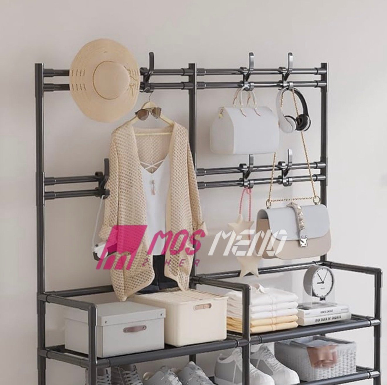 Ky sistem i madh dhe i fortë organizimi shërben si varëse rrobash dhe raft këpucësh, duke qenë zgjidhja perfekte për ruajtjen e sendeve në hapësira të vogla, si korridore apo dhomë gjumi. Dizajni i hapur dhe metalik ofron qasje të lehtë dhe ventilim.